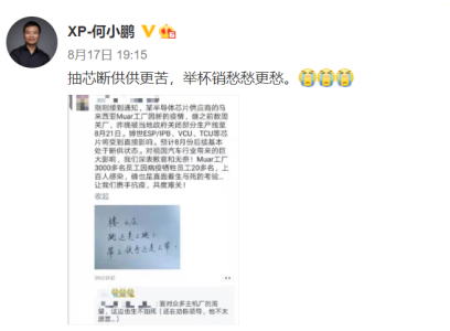 馬來西亞芯片廠打個噴嚏,中國汽車業得了重感冒。一家工廠減產,竟引得博世中國一、二把手“相約去跳樓”,小鵬汽車CEO捂臉?8月17日,博世中國副總裁徐大全發佈了一條朋友圈,他表示某半導體芯片供應商位於馬來西亞麻坡Muar的工廠受新冠疫情影響較大,工廠的3000多名員工中有上百名確診新冠,不幸病故的員工已有20多名,當地政府不得不勒令其關閉部分生產線至8月21日。