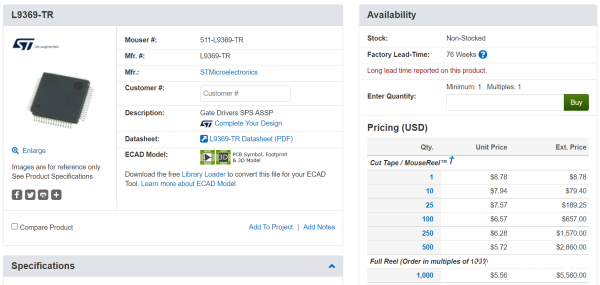▲意法半導體L9369-TR芯片要到76周後才會可能有貨。