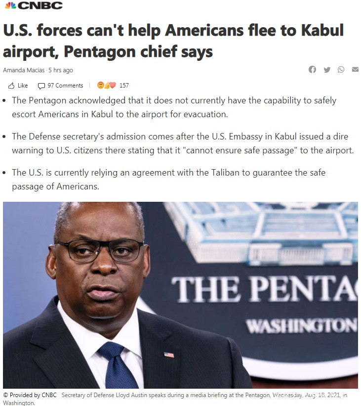 CNBC: 五角大樓週三承認,隨着塔利班鞏固對阿富汗首都的控制,它目前沒有能力安全地護送喀布爾的美國人到機場進行撤離。