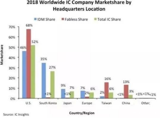 1.芯片一定有一個設計公司,製造出來公司再賣到市場上。可以是自己造,就是IDM模式,設計製造都包;越來越流行讓市場代工,就是Fabless模式。按設計公司所屬地區分類很有道理。IDM生產的比Fabless的要多一些,佔65%。