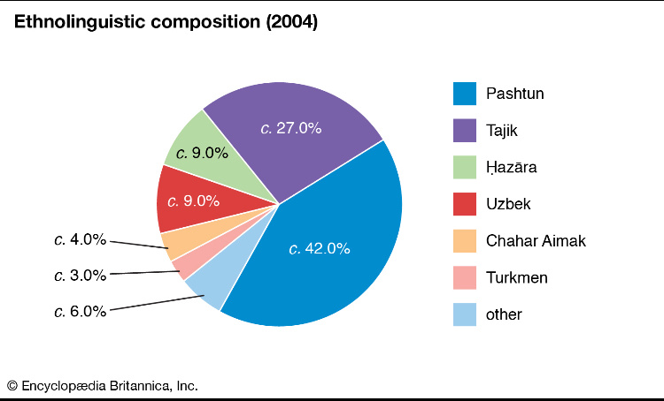 四、英國人的估算,最大民族普什圖(Pashtuns)大約五分之二、塔吉克四分之一、哈扎拉和烏茲別克各佔十分之一,還有無數無法統計的小民族。