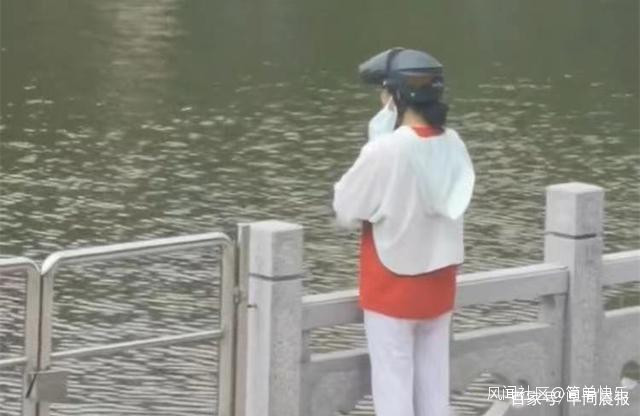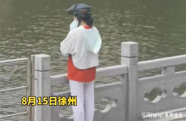 8月15日,江蘇徐州,一名頭戴安全帽,身穿白色防曬服的女子站在河邊。