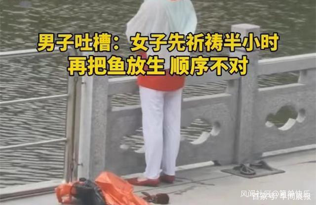 一旁圍觀的男子表示:“你這順序不對,應該先放魚再祈禱啊。”然而,女子卻回覆説:“如果我放了魚,魚兒跑了可就不靈了。”