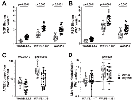 恢復期的個體會發展出隨着時間的推移而成熟的 B 細胞譜系,從而增加他們對 SARS-CoV-2 變體的活性 ( 27 )。為了檢驗在接種 mRNA-1273 的個體中會發生類似現象的假設,對於每個時間點,我們計算了針對每個變體的活性與 WA1 的比率;然後我們比較了第 43 天和第 209 天的比率。對於 S2P 和 RBD,第 209 天的 WA1 與 B.1.351 結合的比率大於第 43 天,這意味着識別 B.1.351 的抗體衰減更快(圖. 4 ). 然而,對 ACE2 競爭抗體和針對 B.1.351 的活病毒中和觀察到了相反的效果。這也可以在圖 1 中看到,其中變體的點在第 43 天比在第 209 天對於 S-2P 和 RBD 結合更接近,但在活病毒中和中在第 209 天彼此更接近。對於 B.1.1.7 觀察到相同的模式。假病毒中和或細胞表面刺突結合隨時間沒有顯着差異。這些數據表明,雖然與變異體結合的抗體比 WA1 抗體衰減得更快,但變異體的功能性抗體可能減弱得更慢。