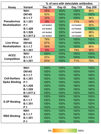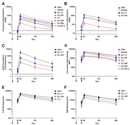 第二次給藥後兩週(第 43 天),所有血清都中和了所有假病毒。反應隨時間減弱:在該測定中,第二次給藥後 6 個月(第 209 天)的所有血清中和了 D614G 和 B.1.429,但中和其他變體的血清較少,分別為 88%、96%、96%、88%、 85% 和 54% 的血清分別中和 WA1、B.1.1.7、B.1.617.2、B.1.526、P.1 和 B.1.351。類似地,使用活病毒測定法,所有血清在第 43 天都對 WA1、D614G、B.1.1.7 和 B.1.351 有活性;在第 209 天,所有血清都中和了 WA1 和 D614G,88% 的血清中和了 B.1.1.7,58% 的血清中和了 B.1.351。此外,ACE2 競爭試驗顯示在較晚的時間點對 B.1.351 的活性降低(圖 3)。總的來説,功能測定顯示在單次給藥後或在第二次給藥後 6 個月後,對 B.1.351 和其他變體具有可檢測活性的血清頻率降低。重要的是,所有受試者在反應高峯時對所有變體都具有廣泛的交叉反應功能活性。因此,隨着時間的推移表現出免疫反應減弱的個體可能具有記憶 B 細胞,能夠在暴露於病毒的情況下對這些變體產生記憶性反應,或者可能使用額外劑量的疫苗。