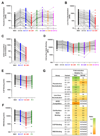 下載高分辨率圖像 在新標籤頁中打開 下載幻燈片圖 2 每個 SARS-CoV-2 病毒變體的相對影響在不同的檢測中是相似的。符號顯示所有樣本在所有時間點的數據;淺灰色線連接來自每個樣本的變體數據;黑線顯示所有樣本的幾何平均值。所有病毒都採用顏色編碼,如圖 1 所示。( A ) 假病毒中和試驗中的 ID50。虛線,檢測限 (>20)。( B ) 活病毒 FRNT 中和中的 ID50。虛線,檢測限 (>20)。( C ) ACE2 與 WA1、B.1.1.7 和 B.1.351 的 RBD 結合的競爭,表示為與無血清對照相比,存在血清時信號的降低倍數。虛線,檢測限 (>2)。( D ) 結合到細胞表面表達的全長尖峯,表示為中值熒光強度 (MFI)。( E) 與 S-2P 的結合,表示為曲線下面積 (AUC)。( F ) 結合,表示為 AUC。( G ) 值比的幾何平均值。不,不適用。
