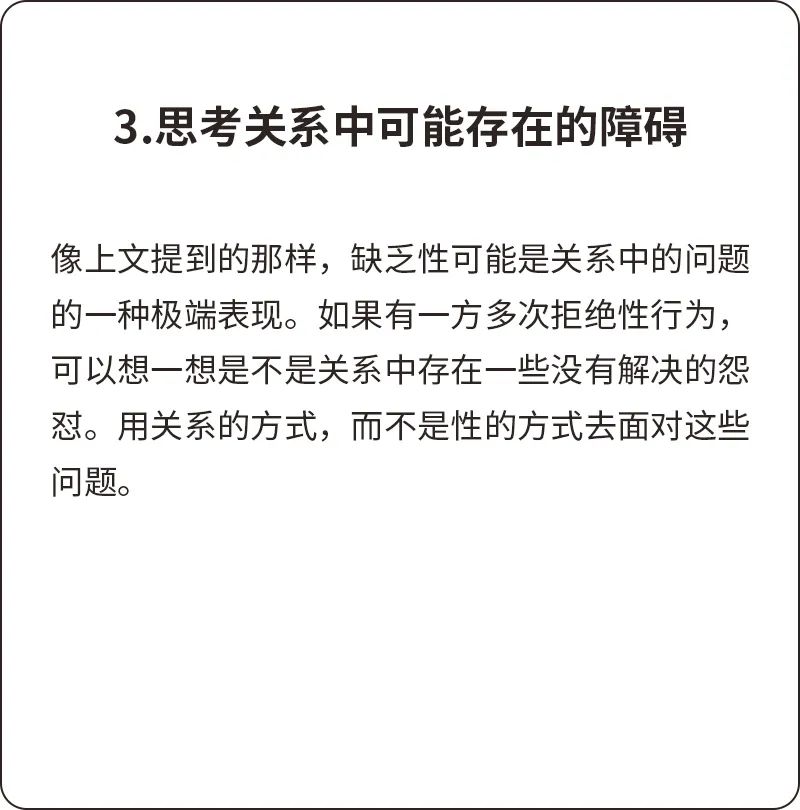 對失控的恐懼和信任的不足也會顯現在無性婚姻的其他方面,只是在性上的表現會更容易被察覺。伴侶們會以為問題僅僅是缺乏性,但背後可能有更深層的原因。