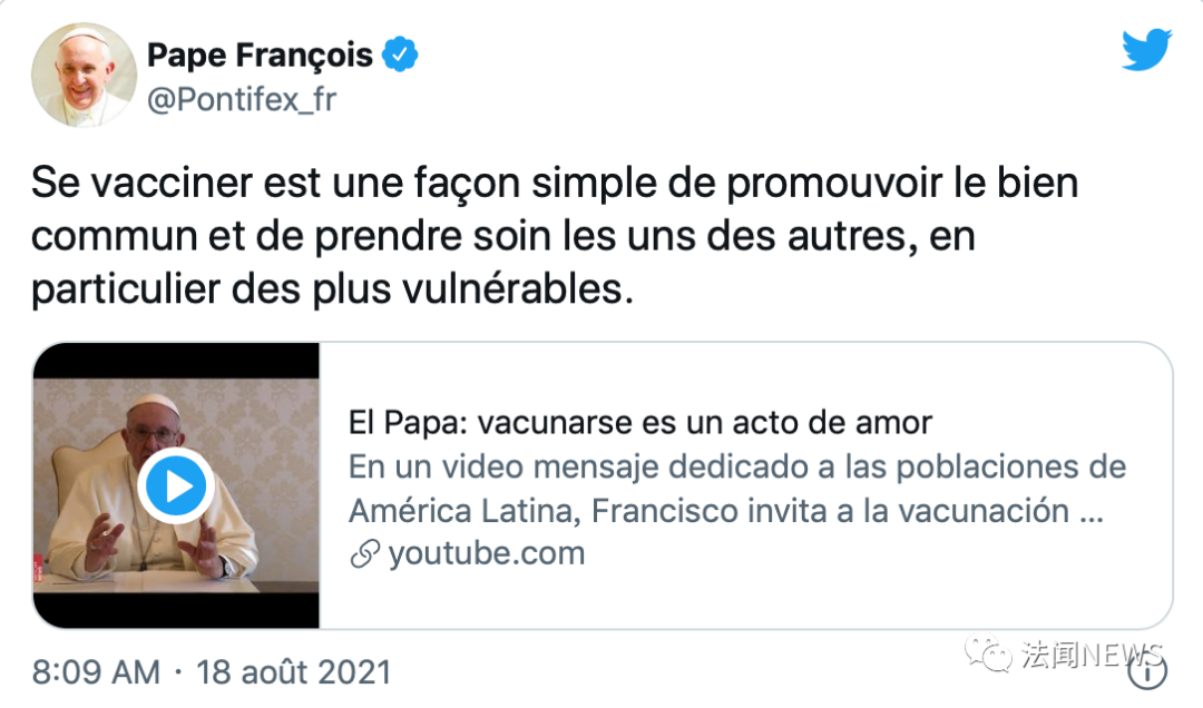 教皇方濟各(Pope Francis)在一段視頻講話中,呼籲所有信徒進行疫苗接種。他説,接種covid-19疫苗是“一種愛的行為”。