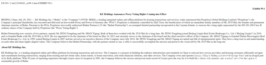 7月30日,貝殼發佈公告顯示,公司的主要股東Propitious Global Holdings Limited(“Propitious”)已簽署並交付了不可撤銷的授權委託書及承諾函(“授權委託書”)。Propitious由Z&Z Trust最終控制,其受益人為貝殼創始人及永遠的榮譽董事長左暉先生的直系親屬。