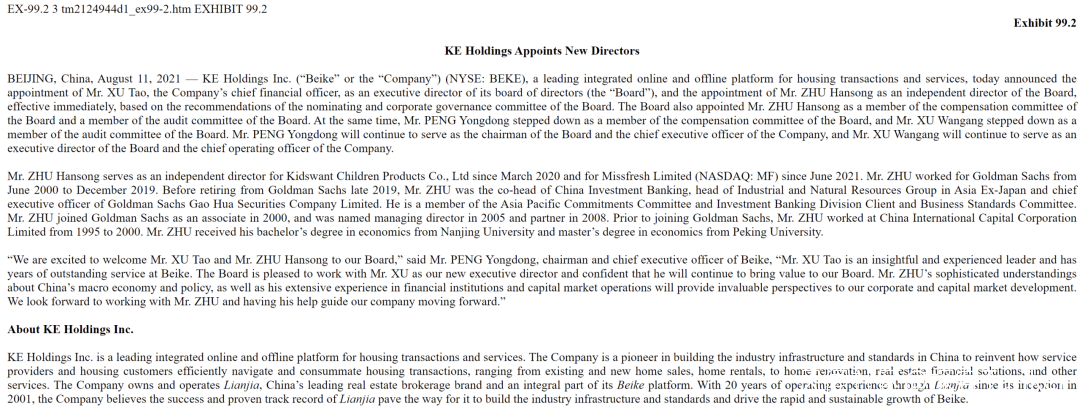 貝殼發佈公告顯示,8月12日宣佈任命CFO徐濤為該公司董事會執行董事,任命前高盛中國投資銀行業務聯席主管朱寒松為董事會獨立董事,並擔任董事會薪酬委員會成員及董事會審核委員會成員。