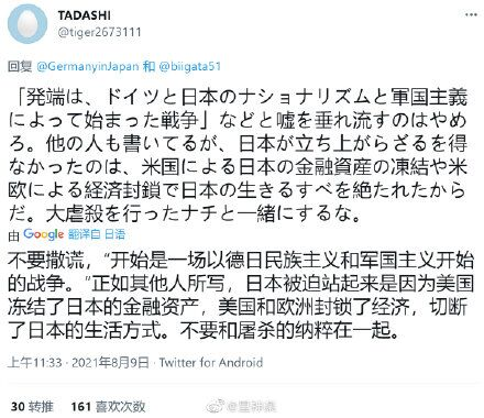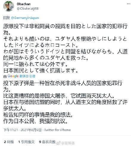 2021年8月9日,德國駐日大使就長崎被原子彈轟炸76週年發佈了一條悼念推特,但推文中“這一切的源頭是德國和日本的民族主義和軍國主義所引發的戰爭”卻遭到了大批日本網民的指責。他們聲稱二戰中的日本與德國不同,日本發動戰爭是“為了解放被殖民的亞洲各國”,而且日本也“沒有納粹集中營、屠殺猶太人那樣的暴行”。