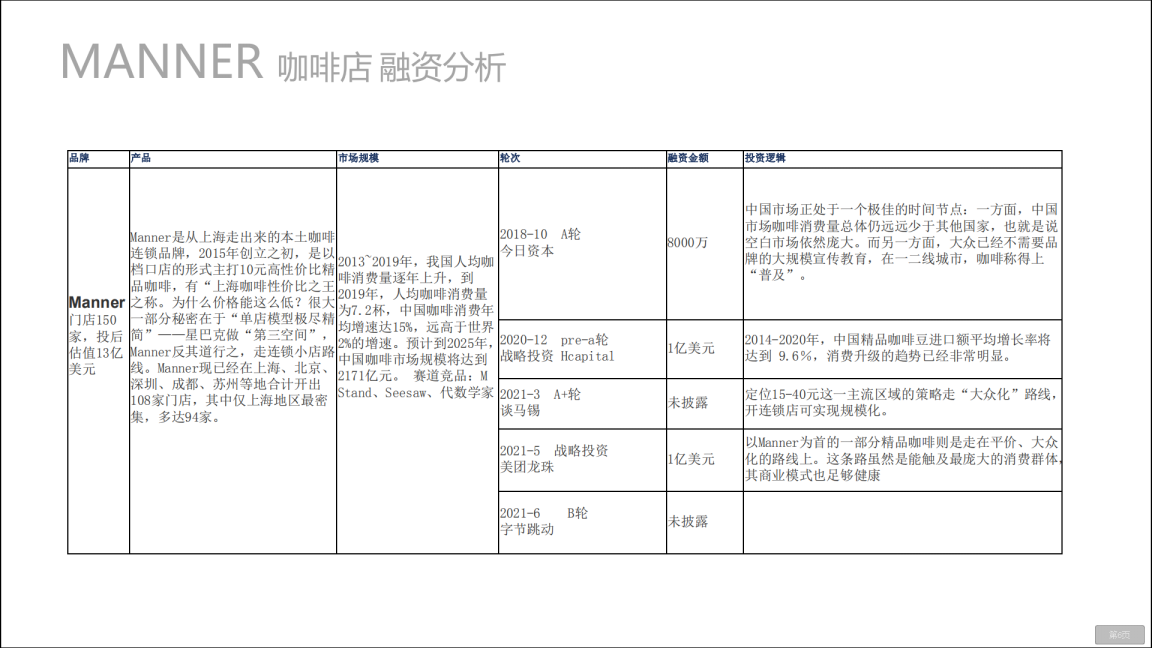 就像當年投TMT行業一樣,用資金換時間,先燒錢快速培養消費習慣,留存客户,再降低費用,露出盈利空間。這種打法,越來越像幾年前的互聯網項目,投資人開始用一種全新的眼光來審視開店這件事情。很多咖啡和茶飲品牌會拿星巴克對標。星巴克在中國有接近5000家店,喜茶有800多家,奈雪不到600家,Manner咖啡200多家。很多投資人算賬的方式——隨着門店數量增加,單店估值會慢慢迴歸到正常水平。