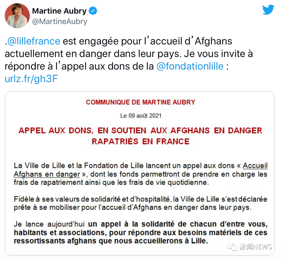 本週四上午,市長在France Inter節目中説,第一批五個阿富汗難民家庭已在週三晚上抵達,而“藝術家們”預計將在今天晚些時候抵達。她説,所有的人的Covid-19檢測都呈陰性。