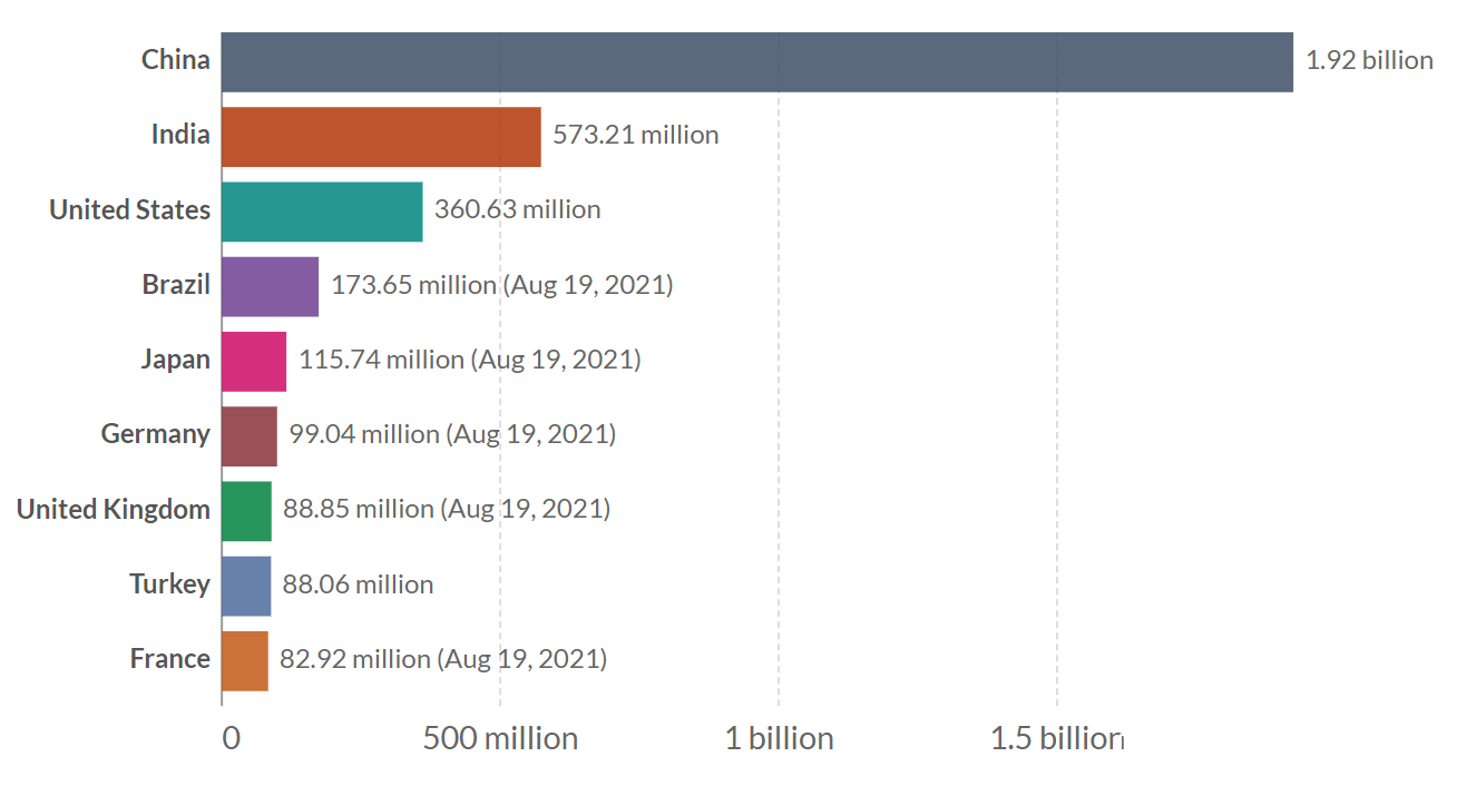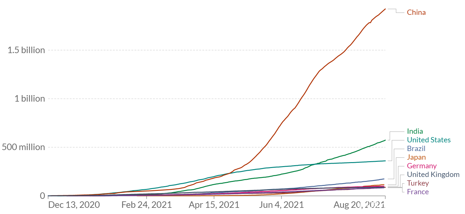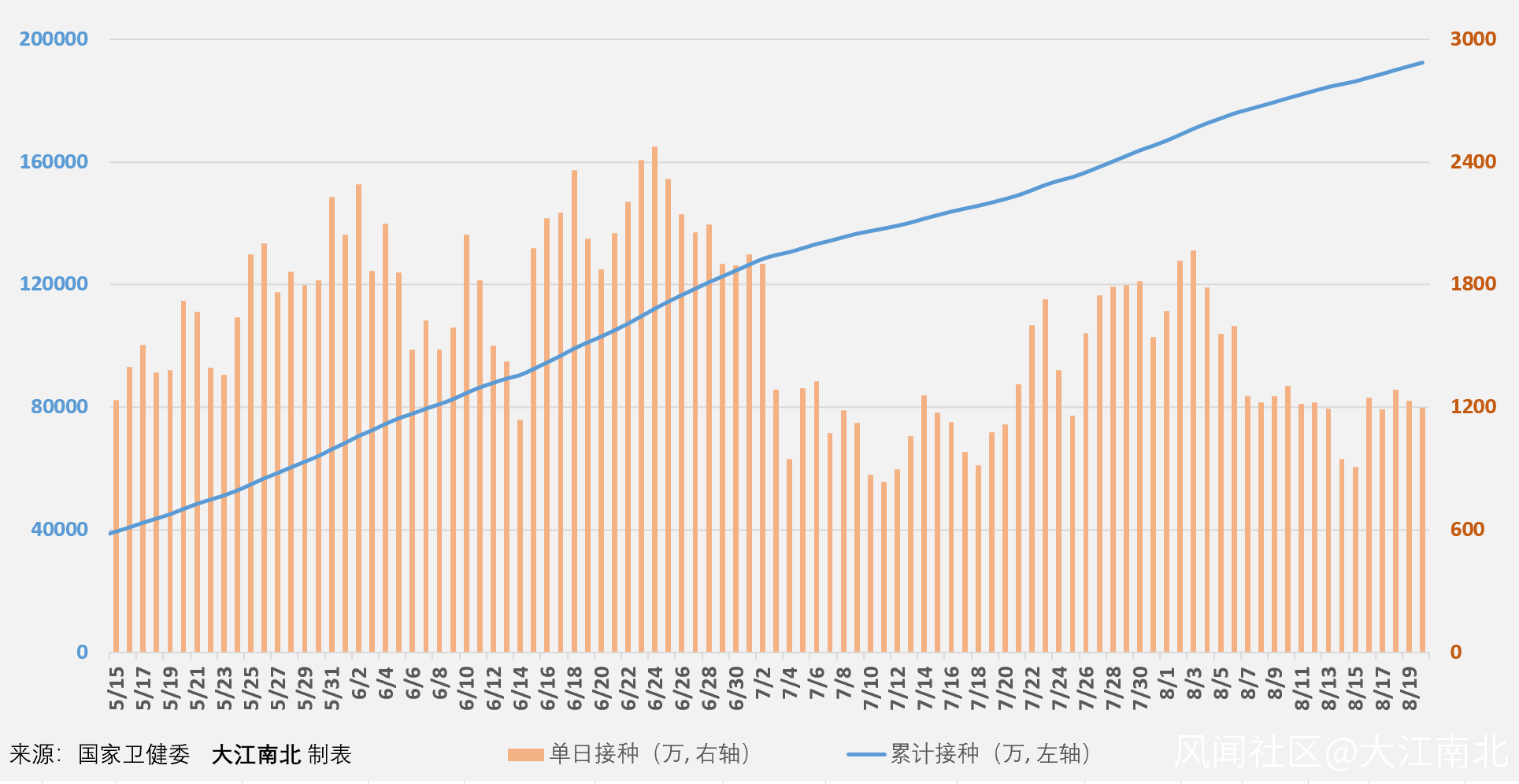 截止2021年8月20日,中國大陸累計接種新冠疫苗19.2439億劑,繼續位居全球第一位,佔全球累計接種劑數的39.2%;其中單日新增接種1197萬劑,佔全球單日接種劑數的28.8%。中國每百人累計接種136.31劑,環比增加0.85劑,是美國的1.26倍,在世界主要大國中僅次於加拿大(每百人138.32****劑)。