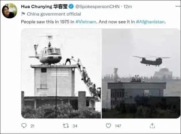 8月17日,中國外交部發言人華春瑩發佈了兩條推特。“人們看見了1975年的越南,現在又看見了阿富汗。”另外一條推特上,華春瑩只寫了半句話——“從實力的地位出發”(from a position of strength),配圖是喀布爾機場美軍警戒線照片和美軍在西貢撤軍行動中著名的“西貢鐵拳”照片。