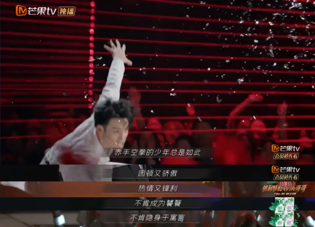 開播時,除去節目陣容,被討論最多的就是芒果的“百萬文案”。“沒有燈塔,就自燃成星夜;無人擲臂,就孤絕地升起狼煙;去見荊棘,炙烈於野火燎過的荒原”開播文案寥寥數語,就將節目的熱血、張力表現出來。
