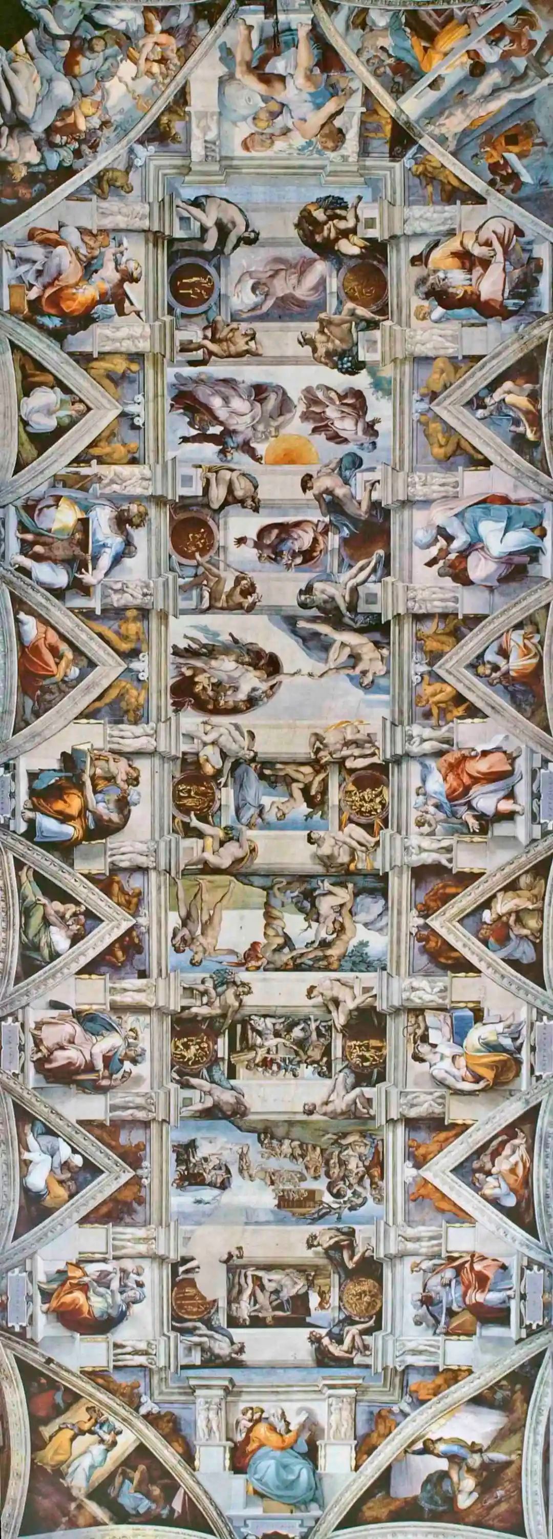 米開朗基羅完成全部天頂繪畫(圖3)的時間為1512年,11月1日天主教萬聖節時西斯廷向公眾開放,第一次展示了全部的天頂畫,這時他37歲。由於在過去四年裏總在腳手架上仰頭作畫,米開朗基羅身體的許多地方都起了變化,他甚至在後來的很長時間裏在讀信時都不得不把信件放在頭頂上來仰頭閲讀。
