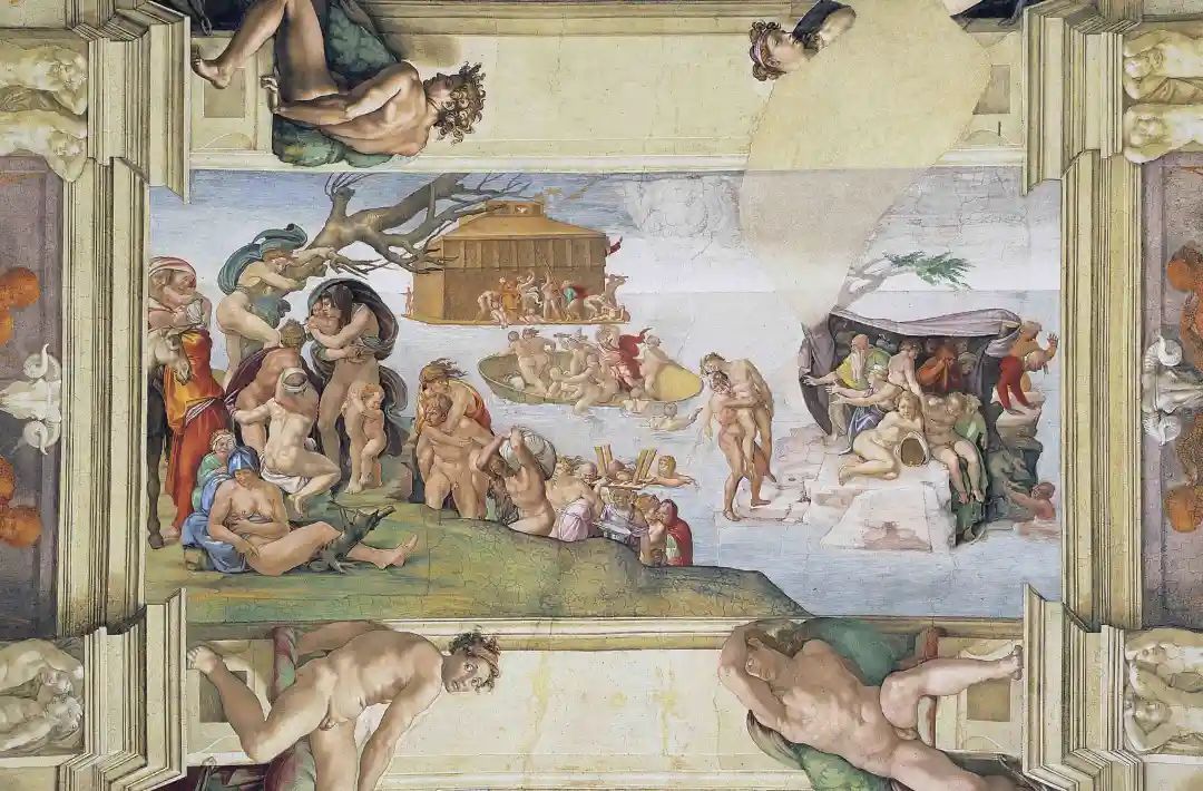 圖11. 米開朗基羅,《大洪水》,濕壁畫,約1508-09年,中間主畫高280釐米,寬570釐米,現陳列於梵蒂岡西斯廷小禮拜堂丨圖片來源:維基百科