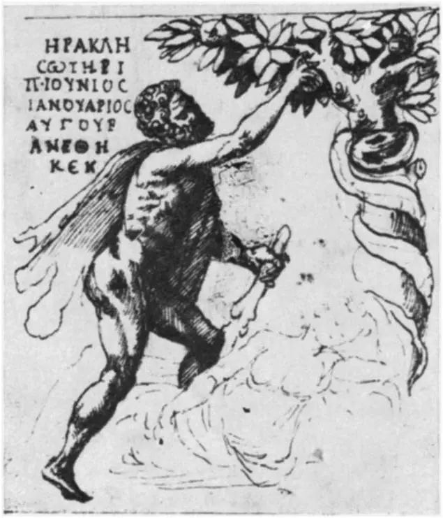 圖16b. 庀洛·利高里奧(Pirro Ligorio),赫拉克勒斯在赫斯珀裏得斯的花園,對拿波里一個古代希臘-羅馬石棺所作的記錄素描。
