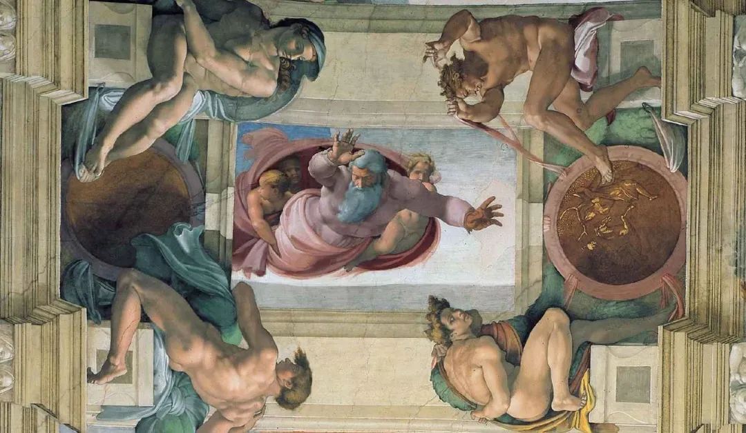 圖4. 米開朗基羅,《上帝將光明從黑暗中分出》,濕壁畫,1511年繪製,中間主畫高180 釐米,寬260 釐米,現陳列於梵蒂岡西斯廷小禮拜堂丨圖片來源:維基百科
