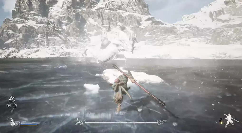 除了場景,實機演示中與怪物的戰鬥吸引了更多人的注意。如果説第一場在雪山與獼猴是延續了上一次演示的高水準,那麼第二場在主要戰役,在冰面上與白龍的戰鬥則是遊戲科學技術力的完美表現。