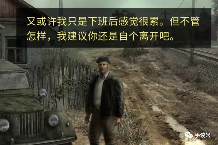 想要去城裏?得看我“車主NPC”心情。主角得幫旁邊小賣店“老闆娘NPC”從排水溝裏把鑰匙取出來,老闆娘一高興,就送你盒煙,然後你把煙遞給車主,就一切好商量了。但車主又説,哥們我不是不想幫你,我發動機壞了呀,你得找“修理工NPC”幫幫忙,然後修理工又會説我太冷了不想幹活,你給我找點木柴來添在爐子裏我就幫你……