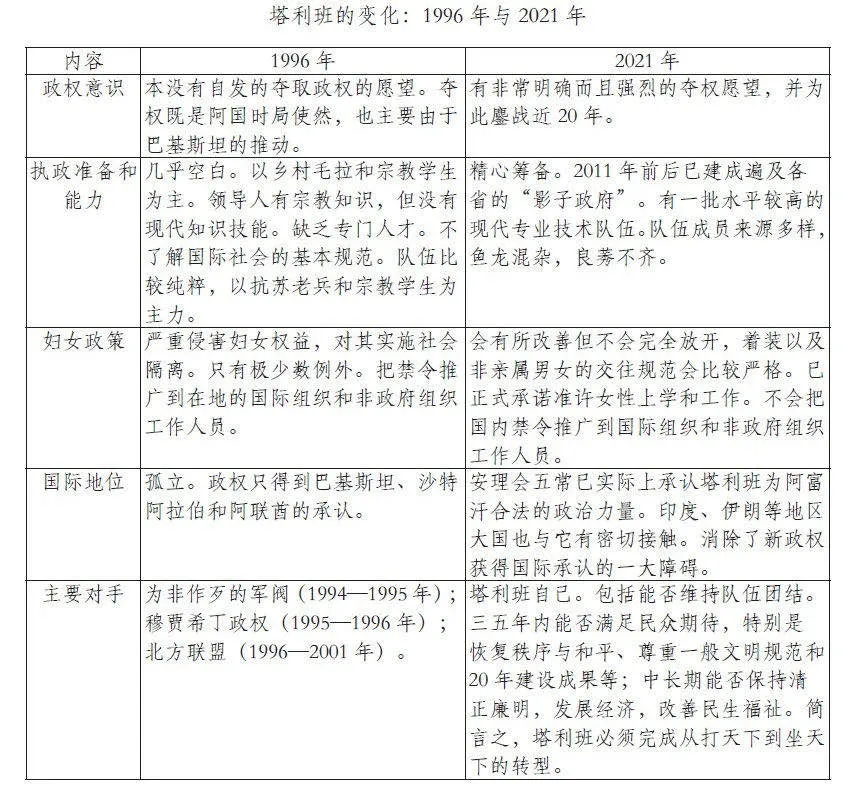 **第二,**塔利班主政是否會把阿富汗帶回20世紀90年代末的“黑暗境地”?筆者認為大概率不會,但其社會治理將會比2002—2021年間更嚴格和保守。塔利班不會簡單重複的原因主要有三個。**其一,**聯合政府中其他力量的牽制作用,國際社會的壓力在一定程度上也有塑造和“規訓”的作用(比如通過“承認”、援助等來規範/換取塔利班的承諾和剋制)。**其二,**阿富汗的社會生態發生了很大變化。阿全國一半以上的人口出生於21世紀,已經習慣了社會和政治自由,這與1996年的境況完全不同。塔利班可以憑藉武力改變政治制度,但不能用武力改變國民的思想和心靈。而且它會汲取上一次執政的教訓。**其三,**今天的塔利班與25年前相比也有了很大變化,具體如下表所示: