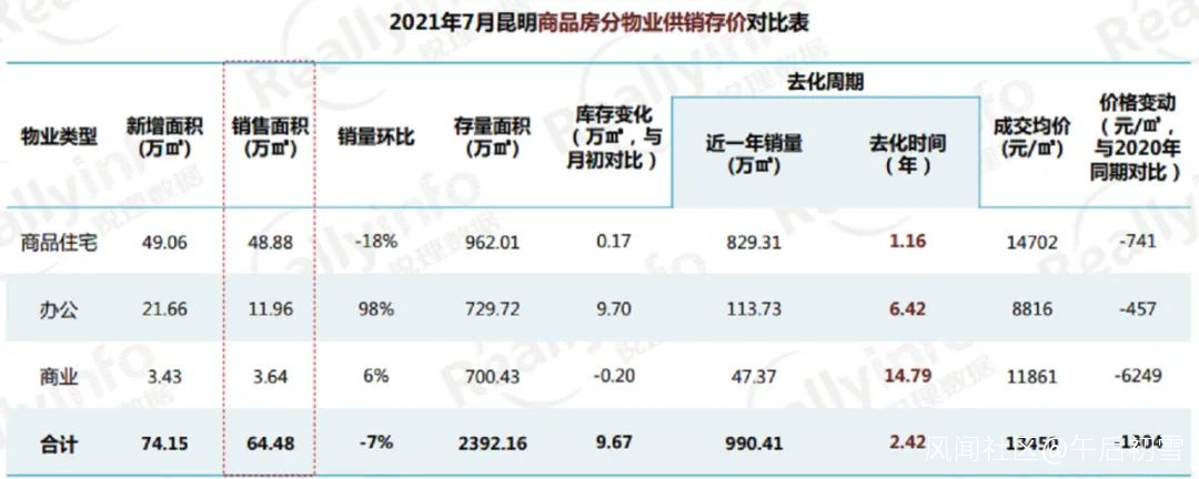 昆明鋭理數據也顯示,7月昆明商品住宅成交均價環14702元/平方米,創過去一年來新低。其中呈貢、官南、滇池跌幅最大,其他片區降幅不明顯。庫存量持續走高,商品房住宅庫存從2017年的約476.22萬平方米,增加至約962.01萬平方米,庫存翻倍,去化週期也由6.87個月增至13.92個月。