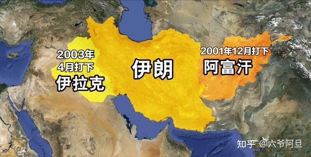但是在2003年,如果你是伊朗,你的感受就會跟所有冠冕堂皇的説辭都不一樣,你只會有一個感受,那就是戰爭的氣息,為啥呢?你只要看一眼下面這個地圖就什麼都明白了。
