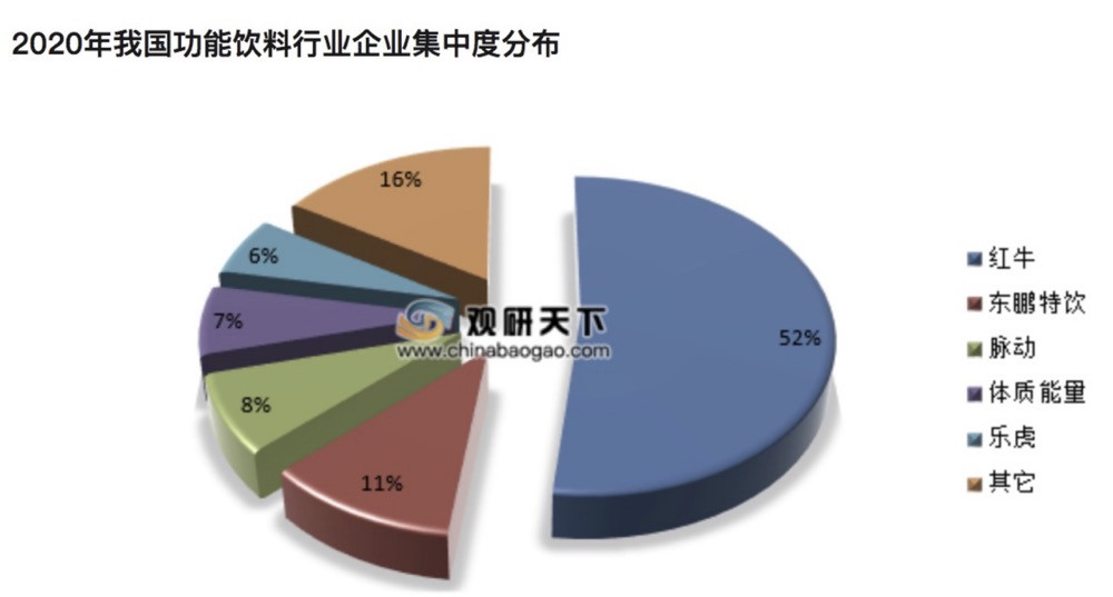 觀研天下報告顯示,2020年,在我國功能飲料行業,紅牛佔去了52%的市場份額;東鵬特飲市場份額為11%,僅次於紅牛;脈動、體質能量、樂虎各自佔據8%、7%、6%的市場份額,整體呈現“一超多強”的狀態。