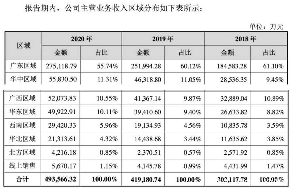 一直以來,東鵬飲料的收入都對廣東區域形成依賴。招股書顯示,2018-2020年,東鵬飲料廣東區域(包括廣東、海南)的銷售收入佔主營業務收入的比重分別達到61.1%、60.12%、55.74%。
