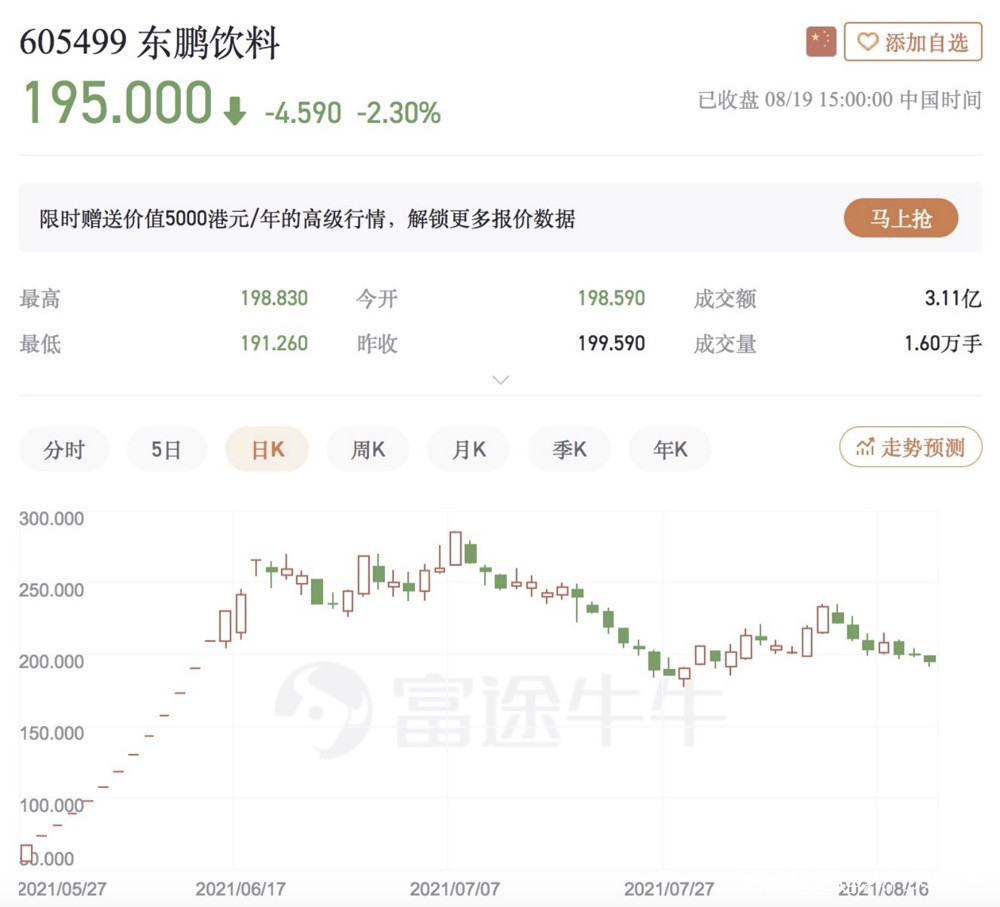 如今,在消費股整體回調的大背景下,東鵬飲料股價也出現回落。但截止8月19日,其股價仍達到195元每股,較46.27元的發行價上漲321.44%,總市值為780億元,市盈率57.71倍,比市盈率41.27倍的貴州茅台高出不少。