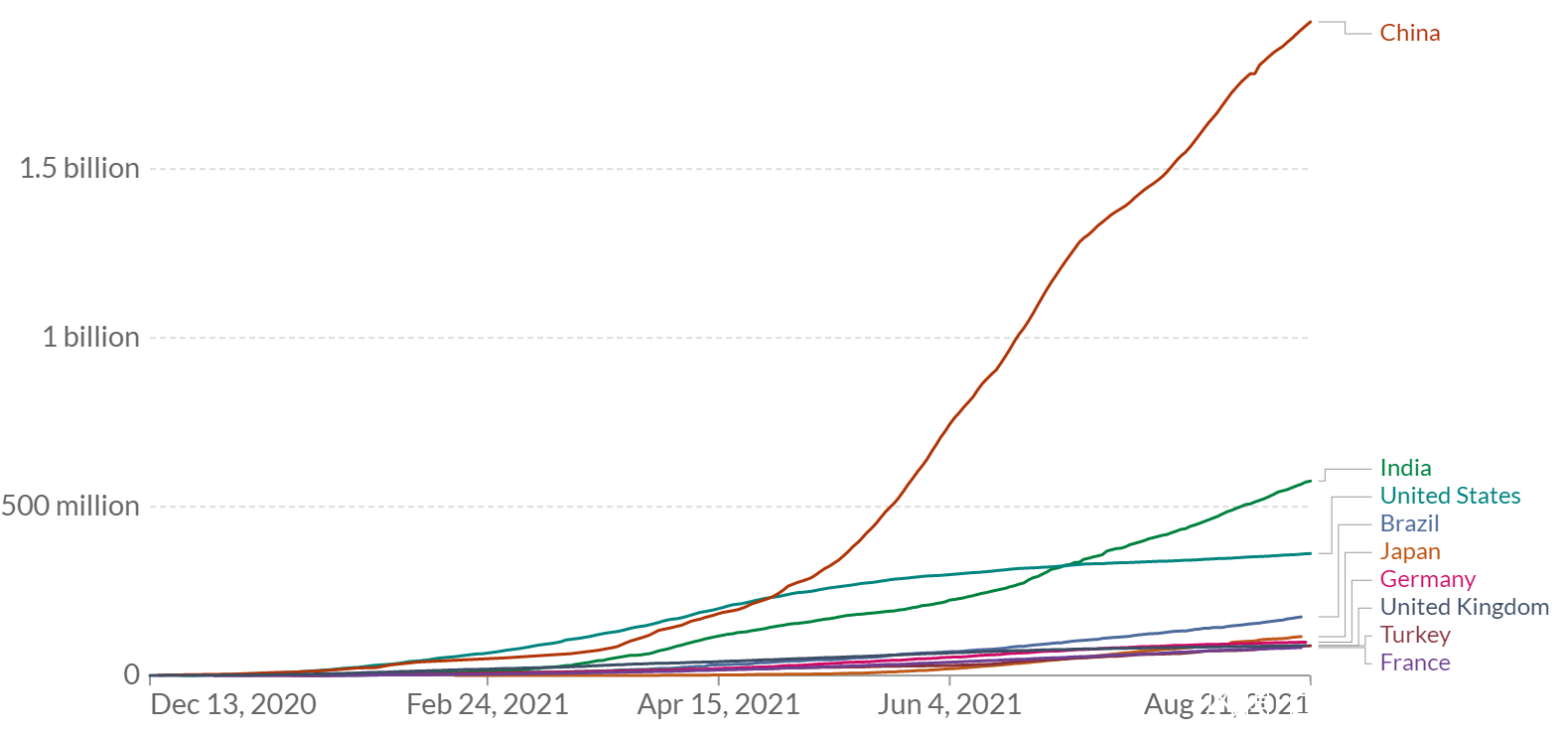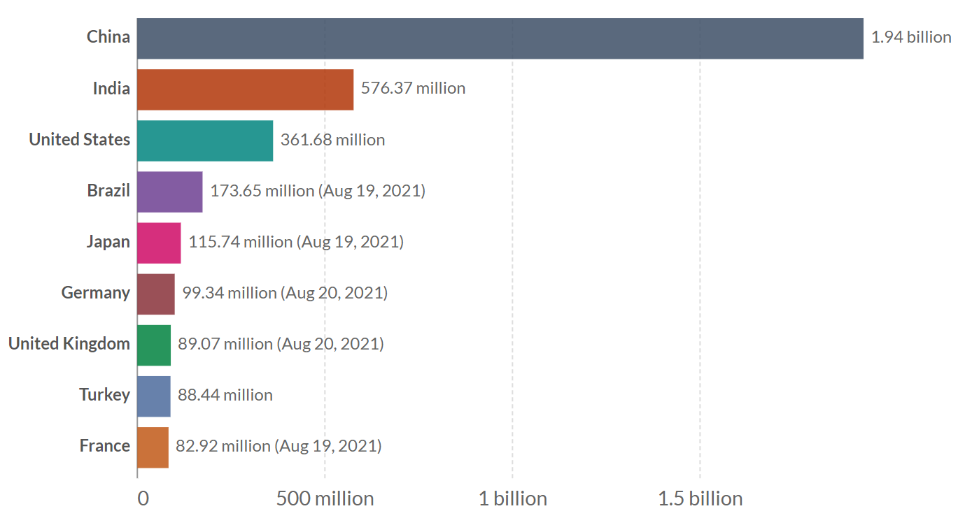 截止2021年8月21日,中國大陸累計接種新冠疫苗19.3587億劑,繼續位居全球第一位,佔全球累計接種劑數的39.2%;其中單日新增接種1148萬劑,佔全球單日接種劑數的32.6%。中國每百人累計接種137.12劑,環比增加0.81劑,是美國的1.27倍,在世界主要大國中僅次於加拿大(每百人138.58****劑)。