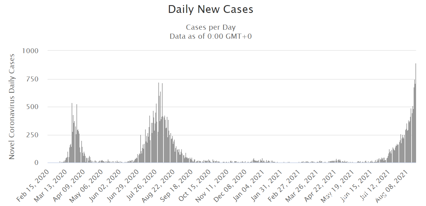 中國台灣:8月21日本地新增確診6例;累計確診15,926例;累計病亡828例;整體病亡率達5.2%****。