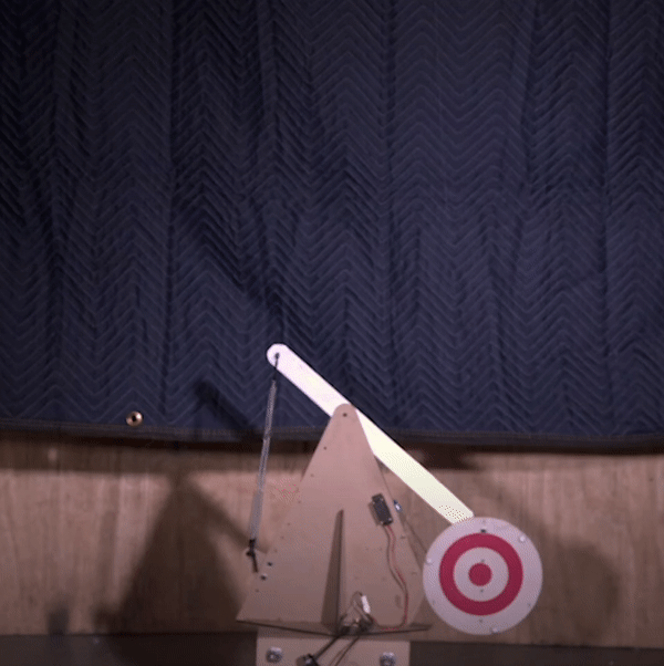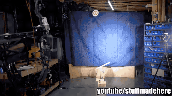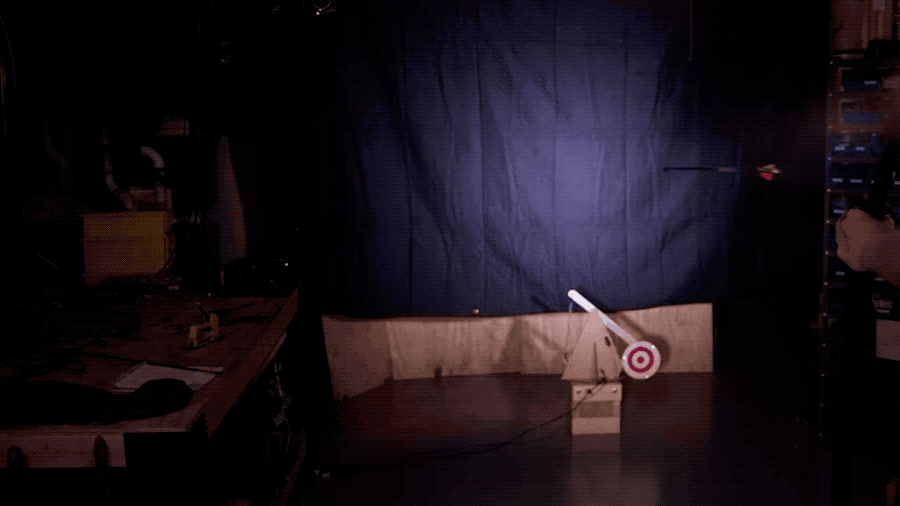 系統每300毫秒檢查一下靶子運動的拋物線軌跡傳給計算機,然後通過一個“乏味”的小計算來確定弓的移動位置,同時考慮到箭頭到達目標的時間以及箭的彎曲路徑。