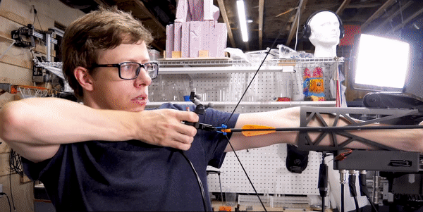 小哥後續解釋道其實把弓拉滿就可以避免這個問題,但在測試期間為了避免射出去的箭力道太大誤傷到房間裏其他物品,只好選擇拉到半滿犧牲一下自己了。