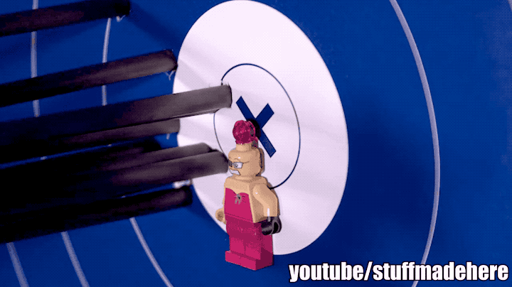 再來更難的挑戰,能不能射中樂高小人頭上頂着的超小“蘋果”。