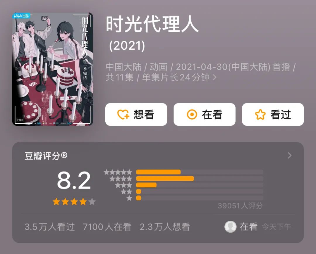 《時光代理人》在B站收穫了9.8的評分,在豆瓣也收穫了8.3的高分。動畫在海外同步播出,目前在歐美最大動漫評分網站MAL評分為8.89。