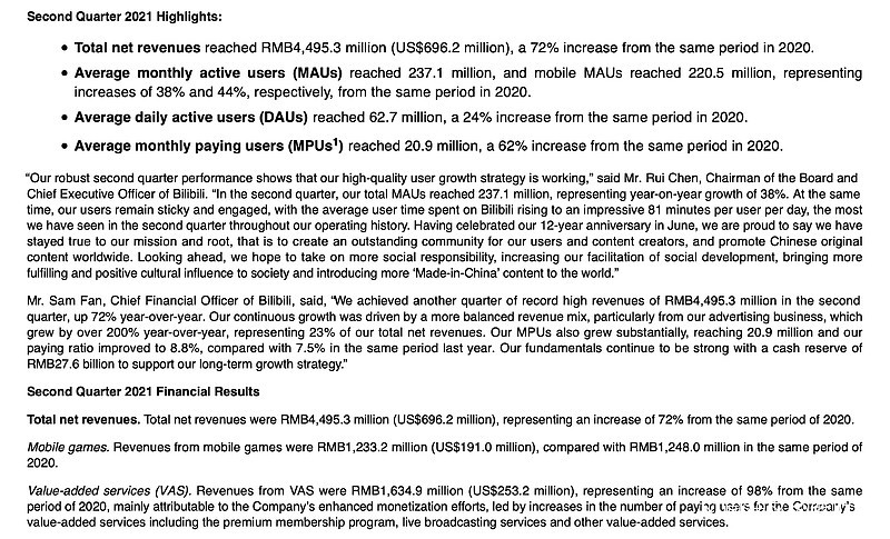 在官方通稿中,B站大肆吹噓種種利好消息,如月均活躍用户(MAU)環比淨增1400萬至2.37億;移動端MAU同比提升44%至2.2億;付費率從去年同期的7.5%提升至8.8%,月均付費用户同比增長62%達2100萬;廣告業務收入單季達10.5億元,同比增長超過200%;截至6月底,該公司現金、現金等價物、定期存款和短期投資總額高達276億元。