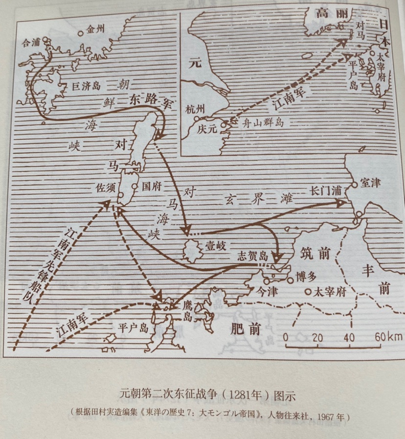 后帝將討日本,三問,良弼言:臣居日本歲餘,睹其民俗,狠勇嗜殺,不知有父子之親、上下之禮。其地多山水,無耕桑之利,得其人不可役,得其地不加富。況舟師渡海,海風無期,禍害莫測。是謂以有用之民力,填無窮之巨壑也,臣謂勿擊便。——《元史·趙良弼傳》