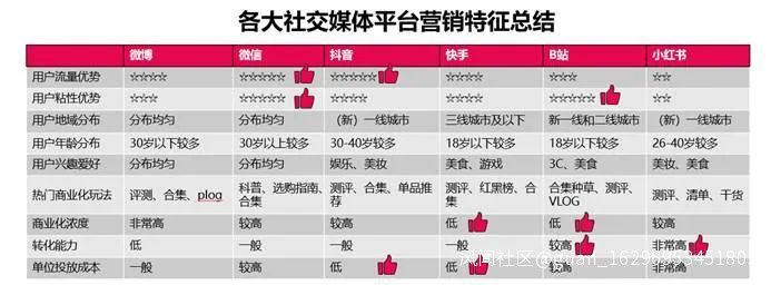 基於上述角度的數據拆解,我們對主流社交媒體平台/短視頻平台進行營銷特徵總結:
