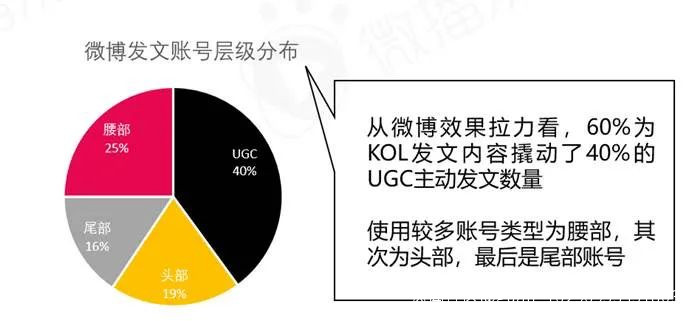 從發文賬號層級角度,60%為KOL發文內容撬動了40%的UGC主動發文數量,使用較多賬號類型為腰部,其次為頭部,最後是尾部賬號。