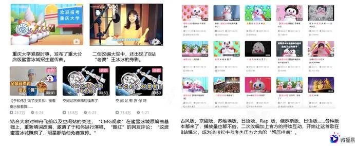 **【第三步:順利創造B站廣泛話題熱點】**官媒、UGC用户等形成自發式跟風創作,將蜜雪冰城推向高潮。重慶大學緊跟時事,發佈了重大分店版蜜雪冰城招生宣傳曲。二創改編大軍中,還出現了B站“老婆”王冰冰的身影。結合大家對神舟飛船以及空間站的關注,“CMG觀察”在蜜雪冰城原編曲基礎上,重新填詞改編,邀請了於和偉進行演唱。“眼紅”的網友評論:“這波蜜雪冰城賺瘋了,明星都給他免費宣傳。”