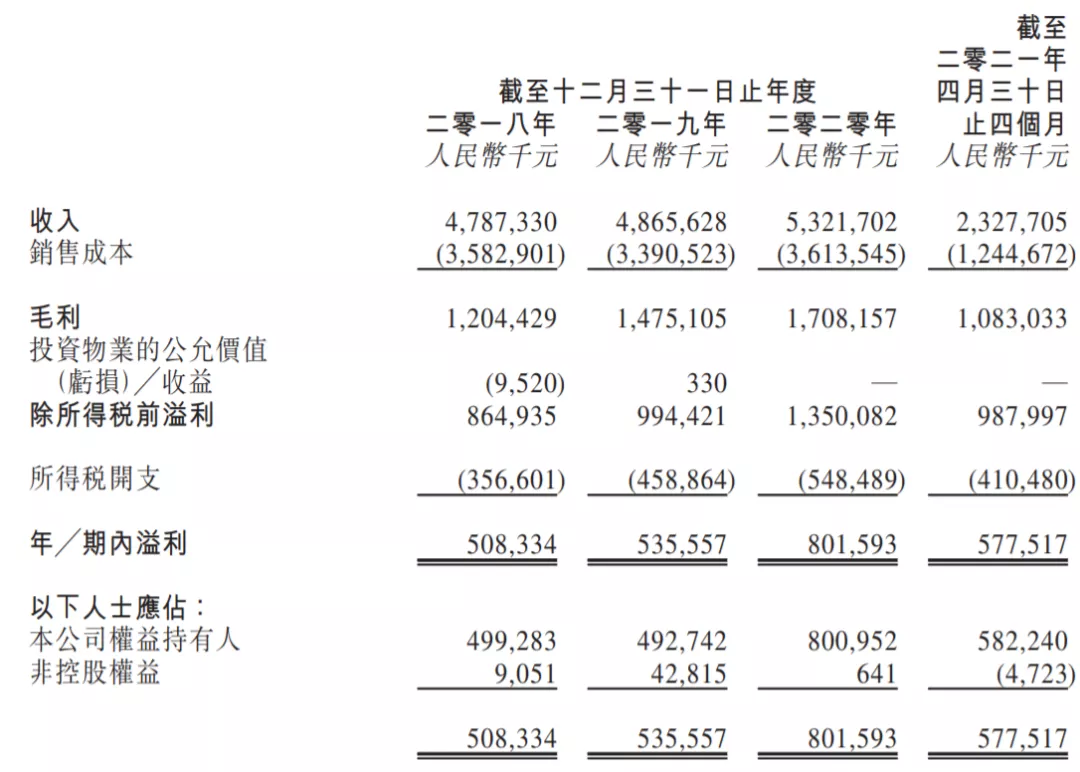 財務數據方面,據招股書顯示,在2018年-2020年和2021年前四個月,新星宇地產的營業收入分別為47.87億、48.66億、53.22億和23.28億元人民幣(下同),相應的淨利潤分別為5.08億、5.36億、8.02億和5.78億元。
