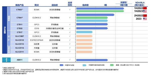 其中CT053作為升級版靶向B細胞成熟抗原(“BCMA”)的全人抗CAR-T產品,正在中國進行關鍵II期臨牀試驗;2021年7月,CT053美國關鍵II期臨牀試驗入組第一例患者。公司計劃於2022年上半年就CT053向中國國家藥監局(NMPA)提交新藥上市申請(NDA),並計劃在2023年上半年向美國FDA提交生物製品上市申請(BLA)。根據科濟藥業公開資料顯示,在中國進行的研究者發起的試驗、以及中國和北美進行的註冊臨牀試驗中,顯示出令人鼓舞的療效和安全性。