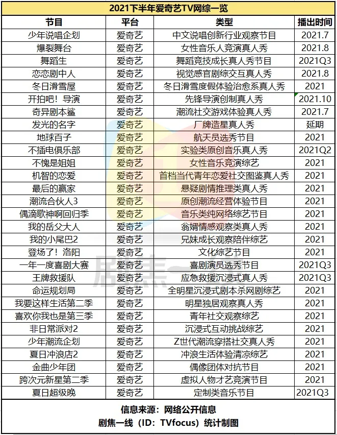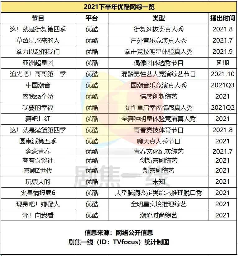 劇焦一線整理的綜藝清單顯示,下半年待播或已播的《中國潮音》《舞蹈生》《少年説唱企劃》《後浪之歌》等節目分別從國風、舞蹈、説唱、原創音樂等維度着手,使得競演的可看性和多元性進一步增強。