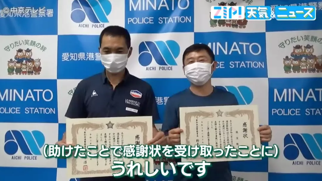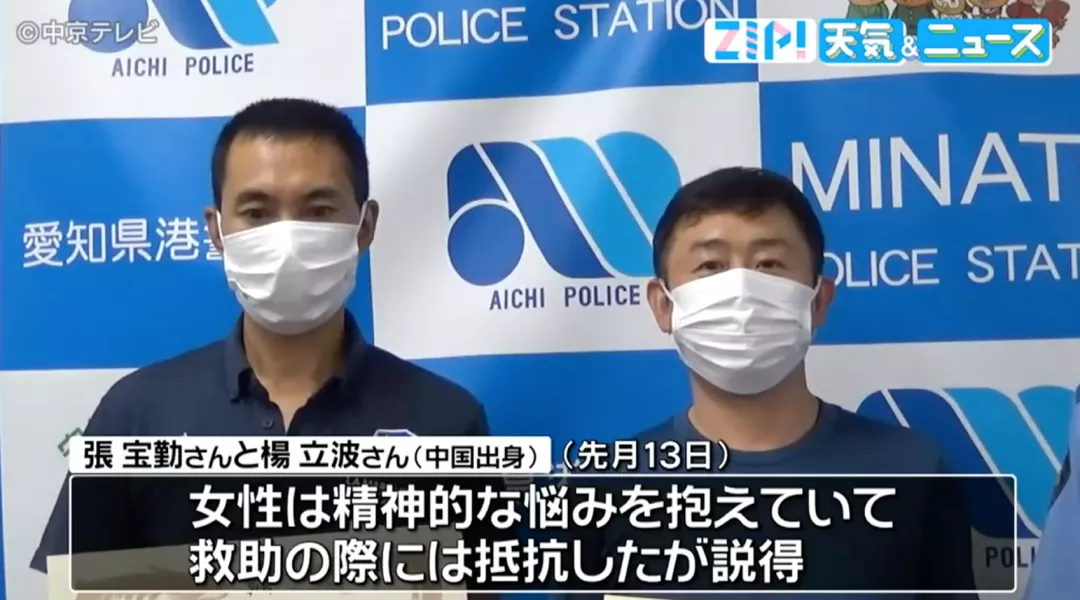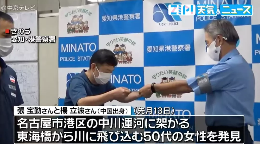 8月19日,愛知縣警察局港區派出所向下圖兩名中國男子頒發了感謝狀,感謝他們見義勇為,拯救了一名本打算跳河自殺的日本中年婦女。