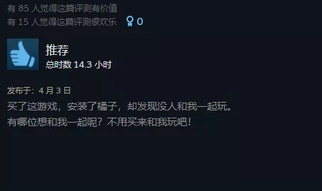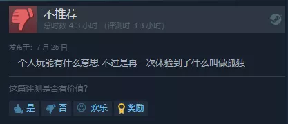 不過話説回來,也不是所有人都會這麼温柔。如果玩家購買了多人遊戲卻找不到一起玩的同伴,體會到挫敗感的他很可能會黯然神傷,進而對遊戲打出“不推薦”的評價,畢竟誰也不喜歡孤獨。