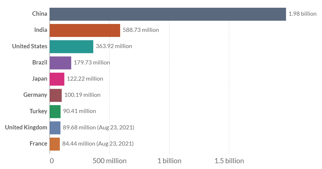 截止2021年8月24日,中國大陸累計接種新冠疫苗19.7574億劑,繼續位居全球第一位,佔全球累計接種劑數的39.2%;其中單日新增接種1385萬劑,佔全球單日接種劑數的37.7%。中國每百人累計接種139.95劑,環比增加0.98劑,是美國的1.29倍,位居世界主要大國之首。