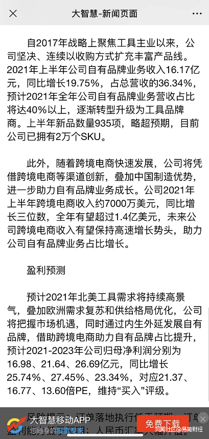 研報顯示,2021年北美工具需求將持續高景氣,疊加歐洲需求復甦和供給格局優化,巨星科技將把握市場機遇,同時通過內生外延發展自有品牌,藉助跨境電商助力自有品牌佔比提升,預計2021-2023 年巨星科技歸母淨利潤分別為16.98、21.64、26.69 億元,同比增長25.74%、27.45%、23.34%,對應21.37、16.77、13.60 倍PE,維持“買入”評級。